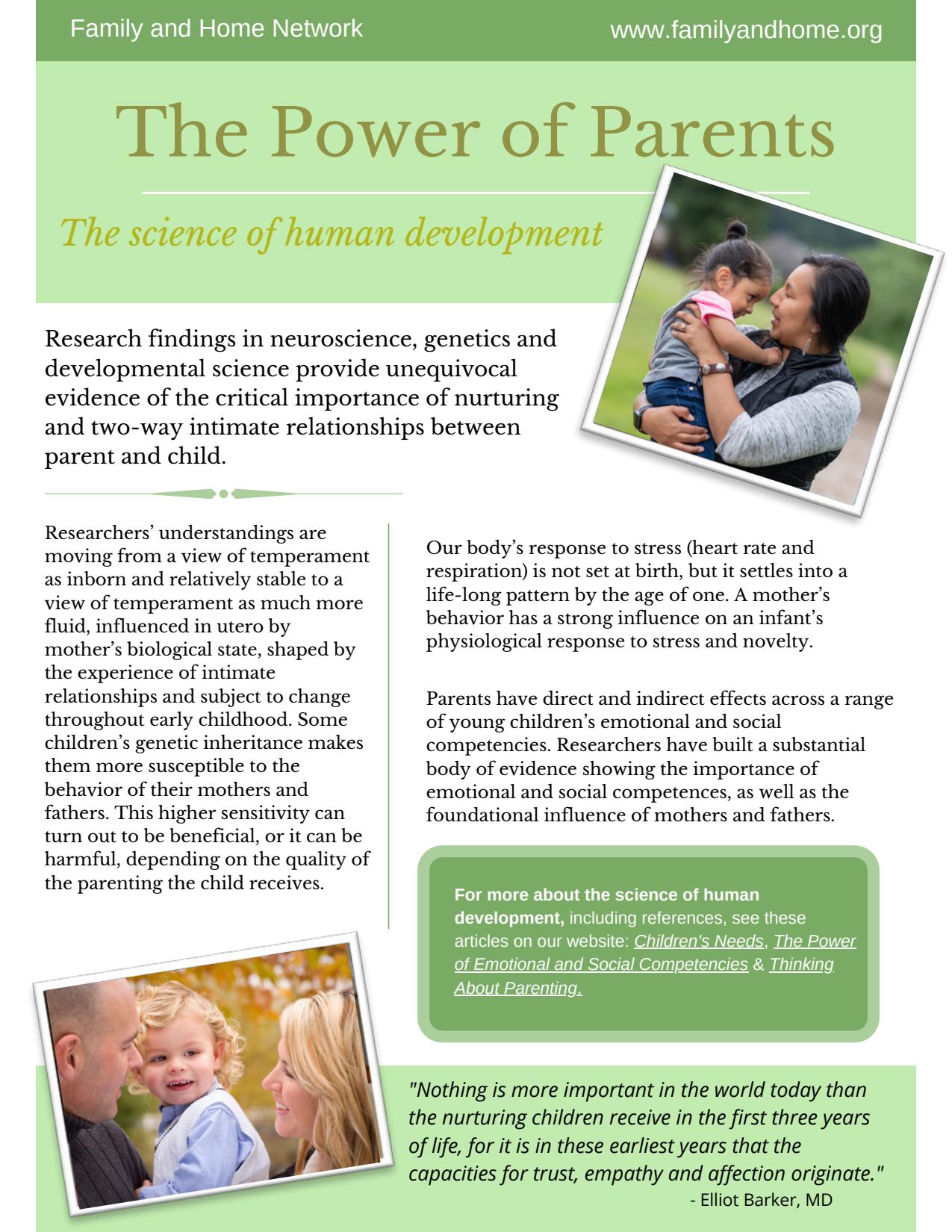 Research findings in neuroscience, genetics and developmental science provide unequivocal evidence of the critical importance of nurturing and two-way intimate relationships between parent and child.